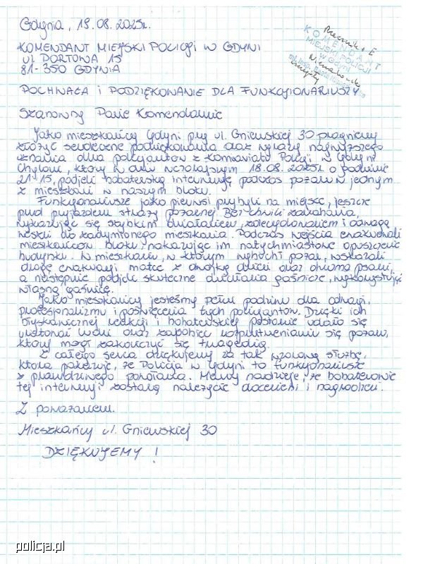Mieszkańcy bloku przy ulicy Gniewskiej, w piśmie wyrazili ogromną wdzięczność i szacunek dla funkcjonariuszy, którzy nie zawahali się wejść w sam środek zagrożenia, aby ratować ludzkie życie i mienie.