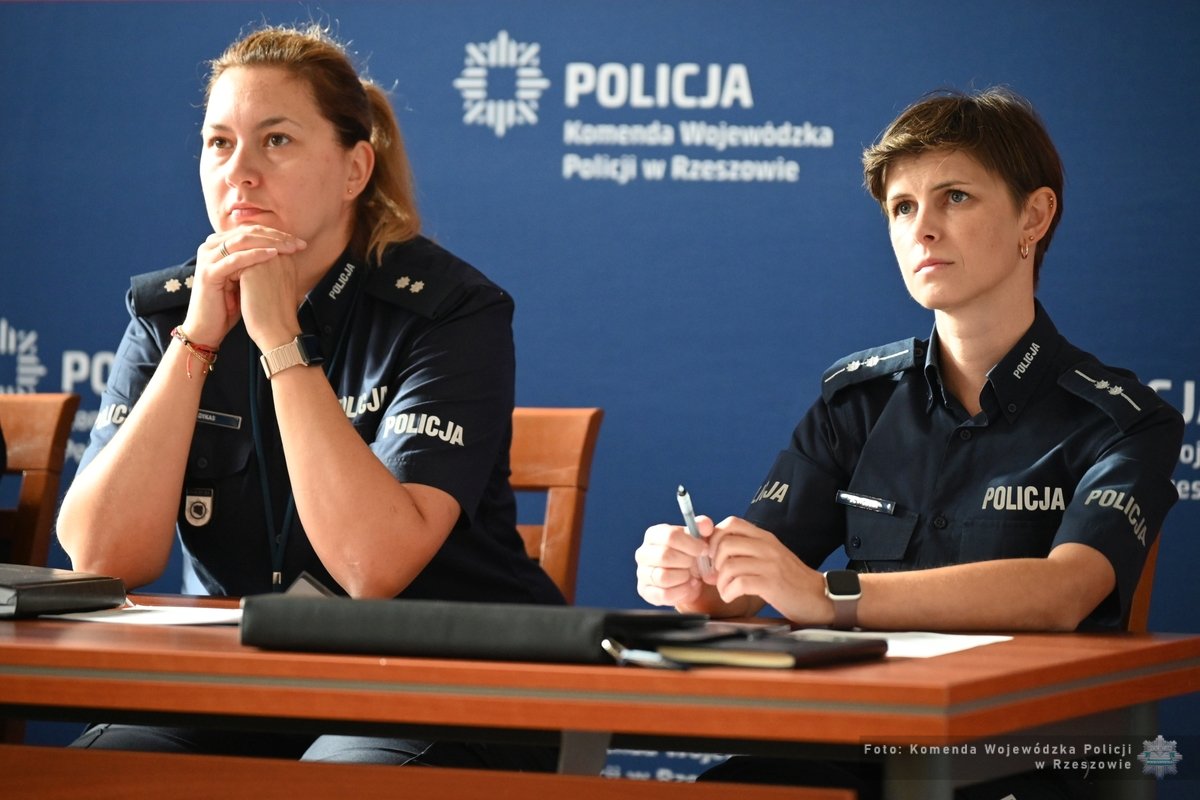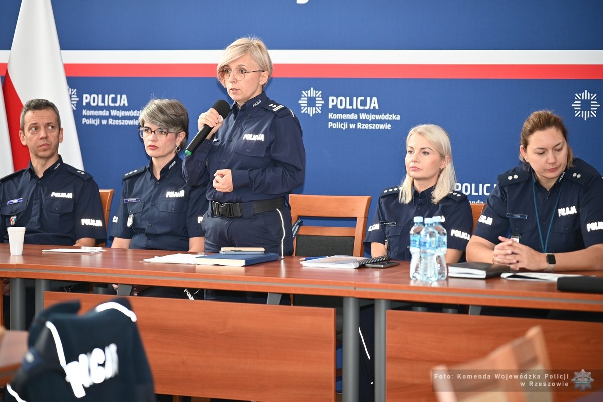 W pierwszej kolejności głos zabrali funkcjonariusze Zarządu w Rzeszowie Centralnego Biura Zwalczania Cyberprzestępczości. Podkom. Piotr Marek, Naczelnik Wydziału Informatyki Śledczej przedstawił zagadnienia związane z pozyskiwaniem informacji o aktualnych zagrożeniach w sieci. W swoim wystąpieniu podkreślił, że wraz z intensywnym rozwojem technologii i postępującej cyfryzacji naszego życia wiedza policjantów w tym zakresie jest niezbędnym elementem przy dostosowywaniu działań prewencyjnych i profilaktycznych. Następnie podkom. Karolina Dykas i asp. Anna Wójcik wskazały na kierunkową profilaktykę związaną z cyberbezpieczeństwem, ze szczególnym uwzględnieniem bezpieczeństwa dzieci i młodzieży. Celem wystąpienia było ujednolicenie przekazu profilaktycznego dostosowanego do różnych grup wiekowych. Jednym z istotniejszych zagadnień wskazanych podczas szkolenia były rozwiązania prawne obejmujące ochronę osób małoletnich przed krzywdzeniem, na które wskazał podkom. Kamil Boroszko, Zastępca Naczelnika Wydziału Operacyjno-Śledczego.