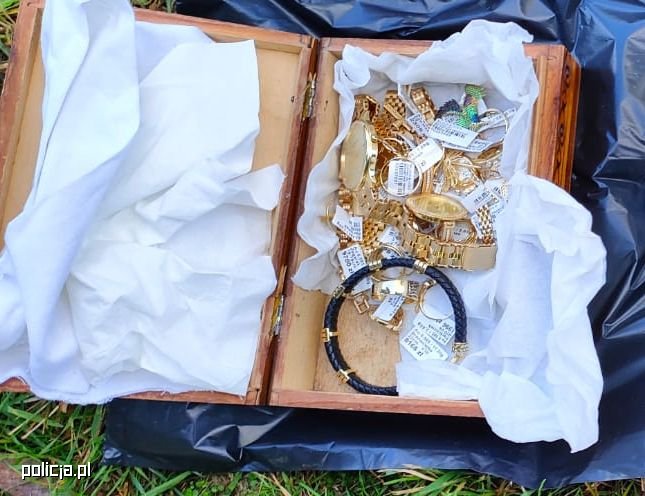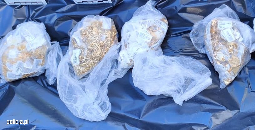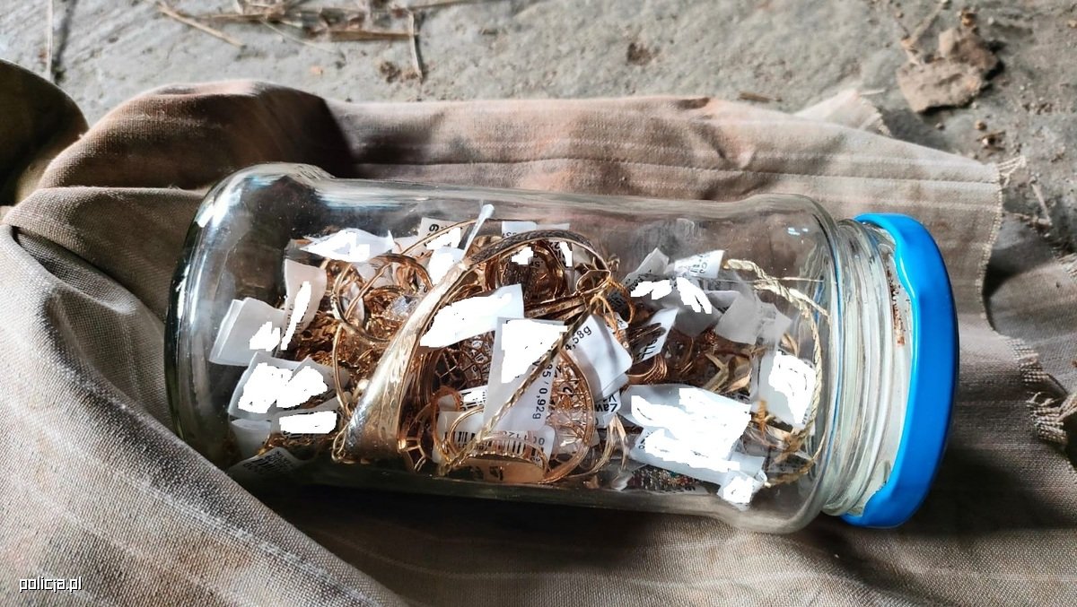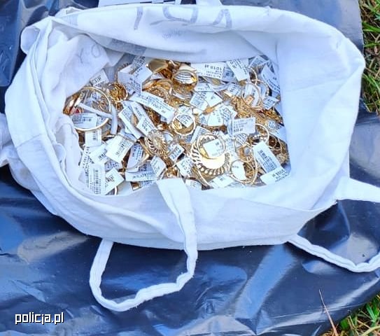 Zapakowane do reklamówek złote łańcuszki, pierścionki i bransoletki policjanci ujawnili w miejscu zamieszkania 39-latka. Część z nich była zakopana w przydomowym ogródku. Inna ukryta była w pomieszczeniu gospodarczym. Ich wartości nie została dokładnie wyceniona, ale pokrzywdzony szacuje, że całość zrabowanego mienia może sięgać nawet 1 miliona złotych.