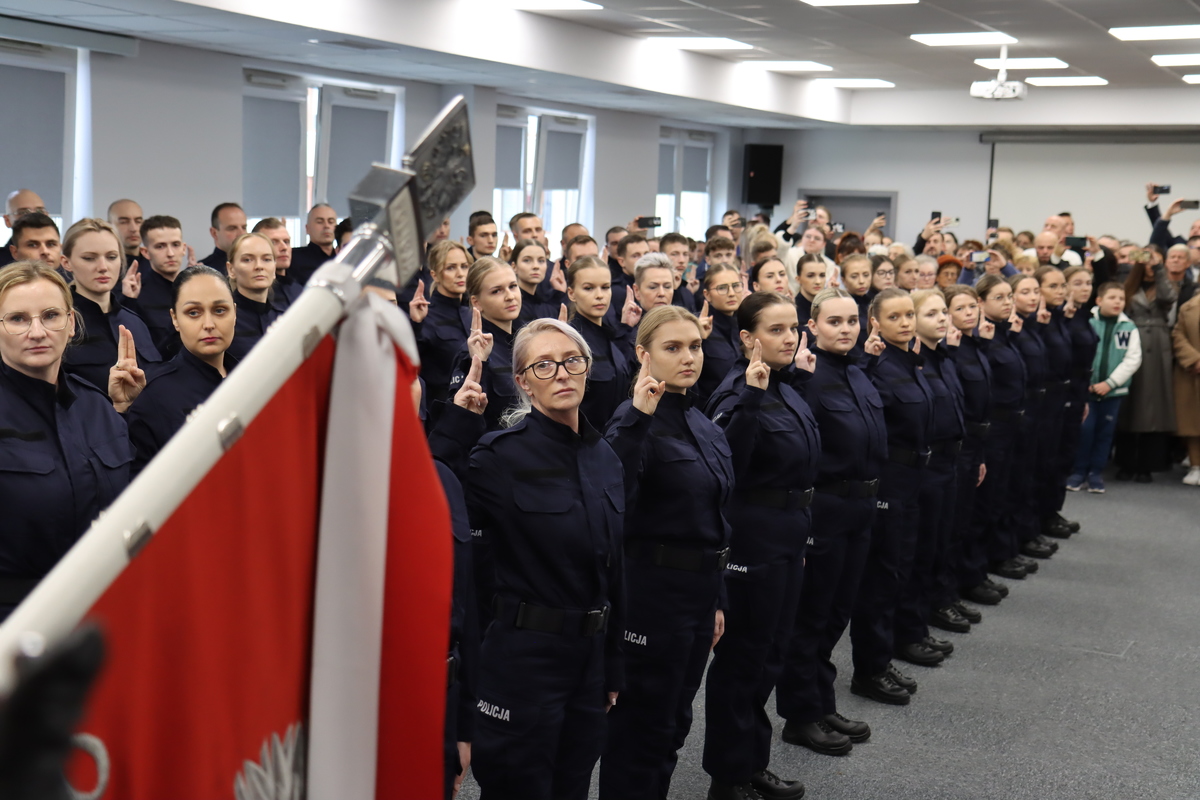 Następnie nowo przyjęci funkcjonariusze na sztandar Komendy Wojewódzkiej Policji zs. w Radomiu złożyli rotę ślubowania: „Ja, obywatel Rzeczypospolitej Polskiej, świadom podejmowanych obowiązków policjanta, ślubuję (...)''. Te słowa, wypowiedziane z głębokim przekonaniem, podkreślają gotowość do stawiania czoła wyzwaniom. W tym roku, gdy świętujemy stulecie kobiecego wkładu w policyjne tradycje, fakt, że 31 z 60 ślubujących to panie, nabiera szczególnego znaczenia, symbolizując siłę i determinację obu płci w budowaniu bezpiecznej Polski.