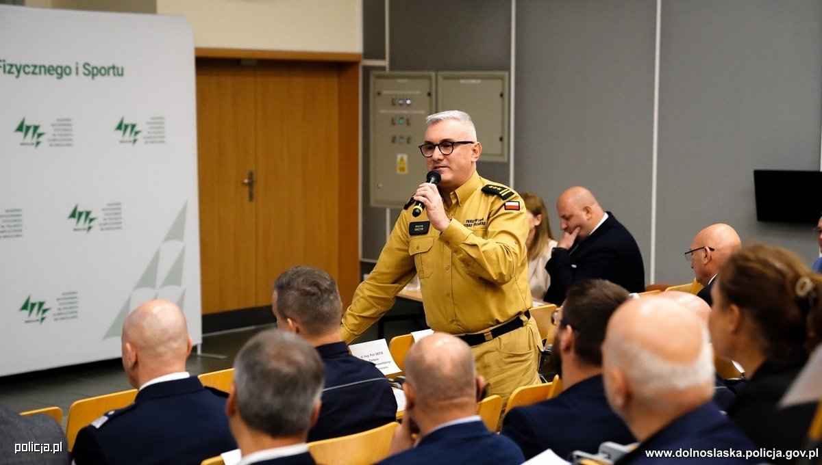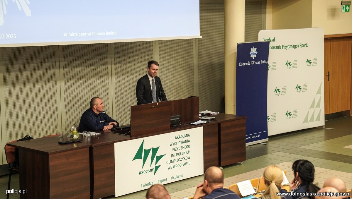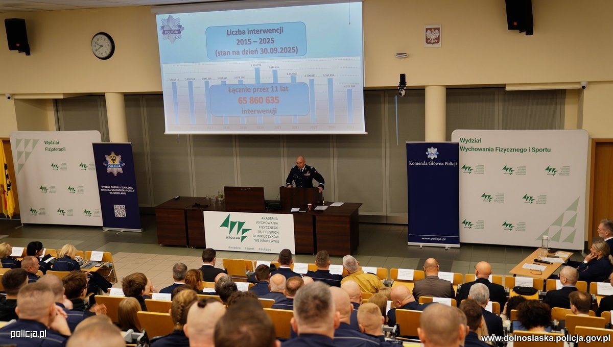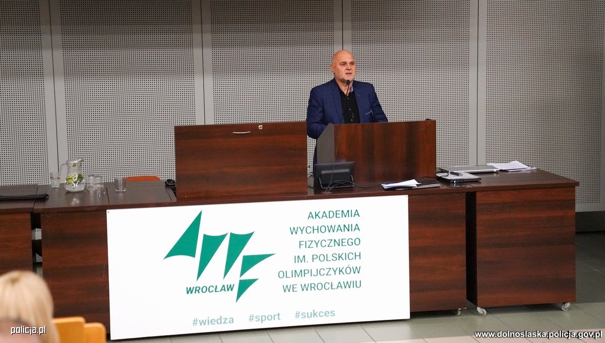 Interweniować mądrze i bezpiecznie - pod takim hasłem 27 października 2025 r. w Akademii Wychowania Fizycznego we Wrocławiu odbyła się I Międzynarodowa Konferencja Naukowo-Dydaktyczna poświęcona interwencjom fizycznym wobec osób z zaburzeniem psychicznym lub niestandardowym zachowaniem. W gronie prelegentów wystąpił nadinsp. dr Rafał Kochańczyk, Zastępca Komendanta Głównego Policji, który - obok przedstawicieli świata nauki i służb mundurowych z Polski i Niemiec - zabrał głos w dyskusji o naukowych i praktycznych aspektach interwencji fizycznych oraz współczesnych wyzwaniach w działaniach służb.
