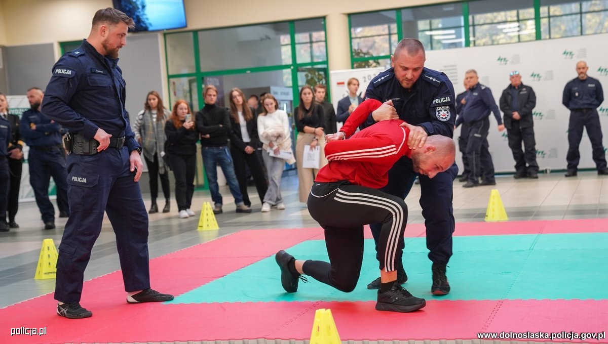 Uczestnicy mieli także okazję obejrzeć pokazy technik interwencji w sytuacjach trudnych, przygotowane przez funkcjonariuszy Komendy Wojewódzkiej Policji we Wrocławiu.