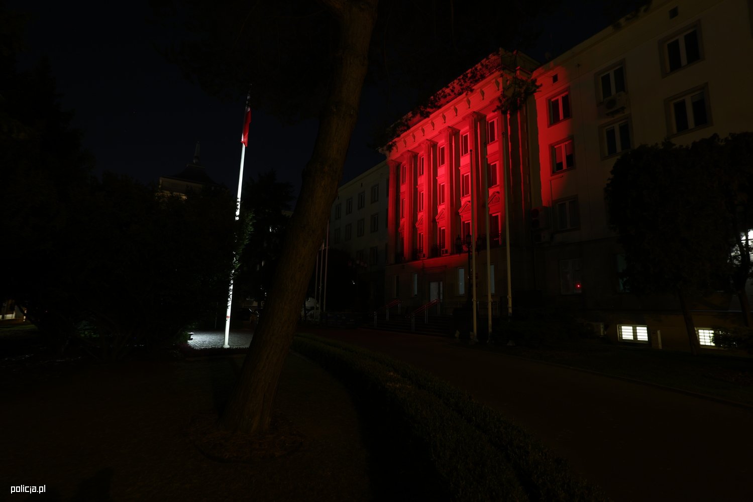 - KWP w Katowicach: KWP w Katowicach podświetlona na czerwono - ogólnopolski finał kampanii "Dzieciństwo bez Przemocy"