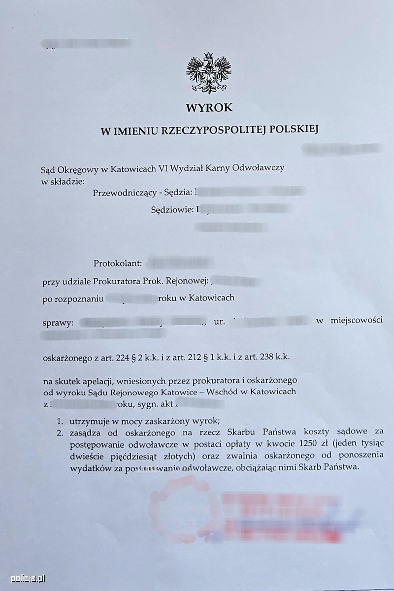W Sądzie Okręgowym w Katowicach zapadł wyrok w sprawie 70-latka, który podczas kontroli drogowej nie tylko nie przyjął nałożonych na niego mandatów, ale później złożył fałszywe zawiadomienie, oskarżając interweniującego policjanta o działania, których ten nie podjął. Sąd wymierzył mu karę grzywny oraz nawiązkę na rzecz pomówionego policjanta.