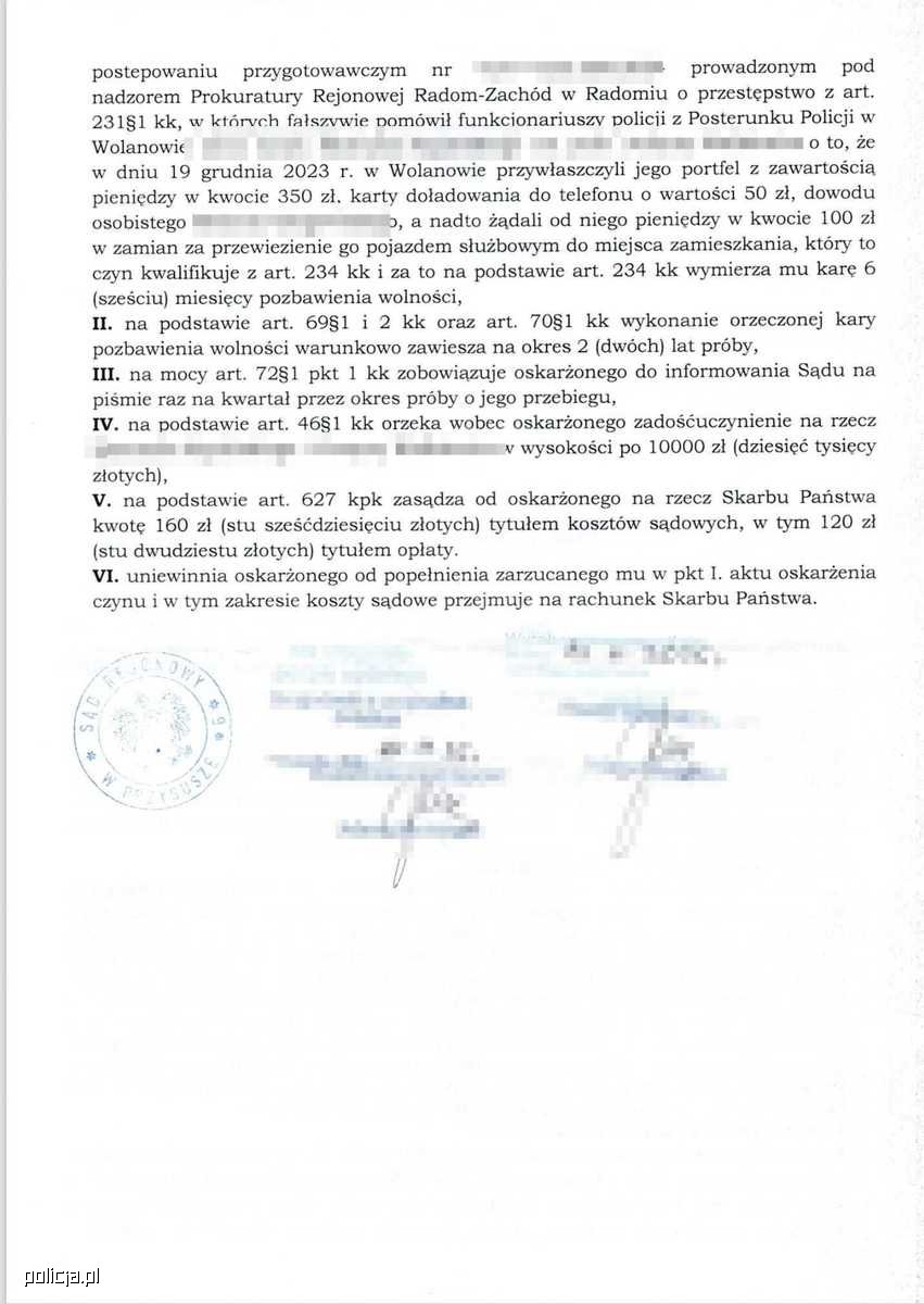 W Sądzie Rejonowym w Przysusze zapadł wyrok w sprawie 52-latka, który złożył fałszywe zawiadomienie, oskarżając policjantów, którzy chcieli mu pomóc o przywłaszczenie portfela z pieniędzmi. Sąd wymierzył mu karę 6 miesięcy pozbawienia wolności w zawieszeniu na 2 lata oraz zadośćuczynienie na rzecz pomówionych policjantów. W ostatnich dniach uprawomocnił się wyrok, który świadczy o tym, że każdy, kto bezpodstawnie oskarży funkcjonariusza musi liczyć się z konsekwencjami prawnymi.