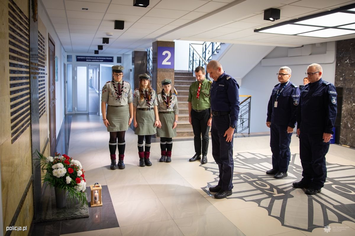 Ogień, który dotarł do Komendy Głównej Policji, został złożony przed Tablicą Pamięci, by oddać cześć i uczcić pamięć tych, którzy zginęli na służbie chroniąc życie i zdrowie obywateli.