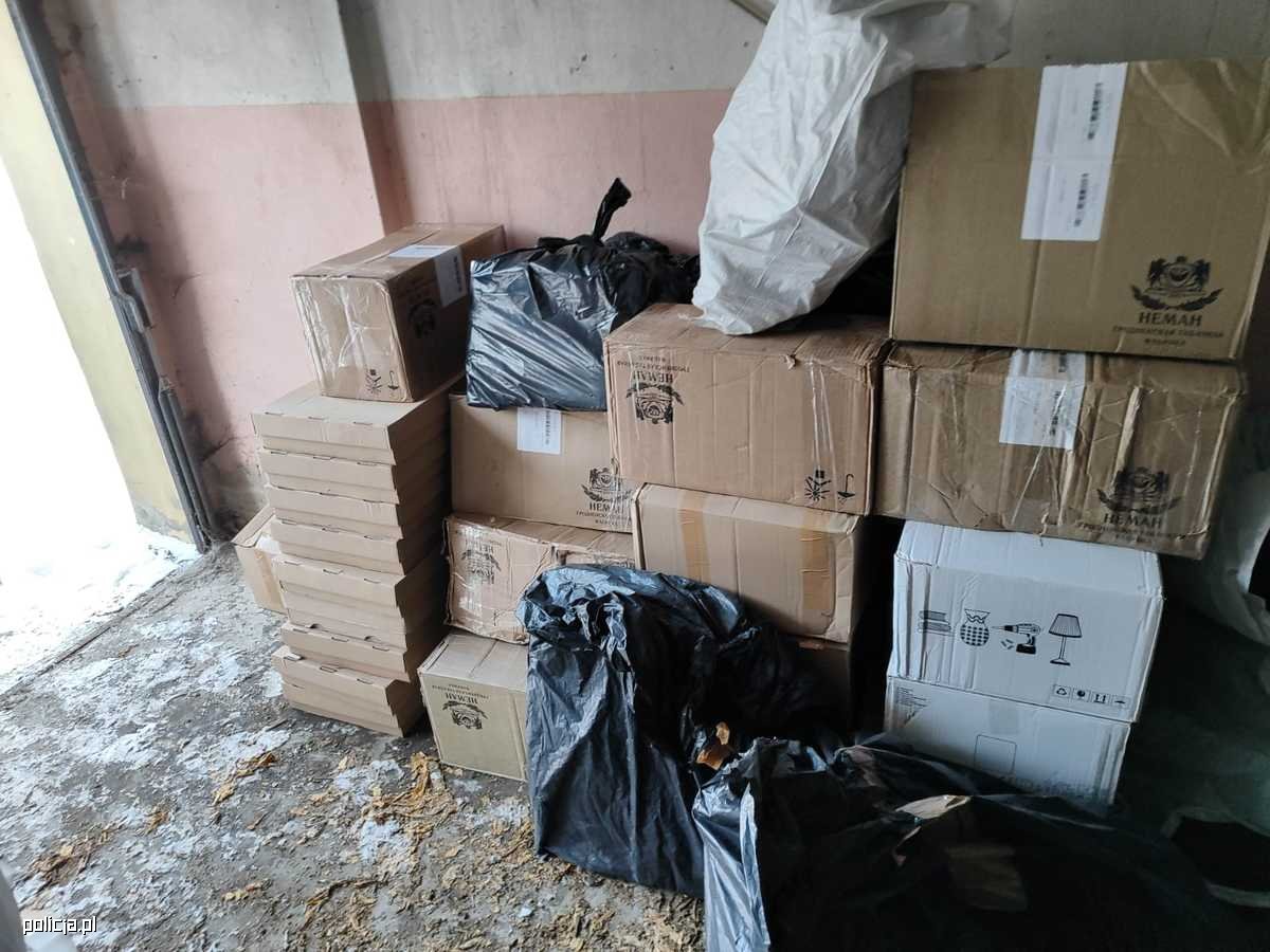 Na tym jednak policjanci nie zakończyli swoich działań. Postanowili sprawdzić posesję przy ul. Limanowskiego, z której wcześniej wyjeżdżał mężczyzna. Na miejscu zobaczyli szereg garaży i pomieszczeń gospodarczych. Świeże ślady na śniegu prowadziły do jednego z nich. W jego wnętrzu funkcjonariusze znaleźli cztery kartony z butelkami PET o pojemności jednego litra, wypełnionymi cieczą o zapachu alkoholu oraz dwie torby z tytoniem, każda o wadze około 0,5 kg.