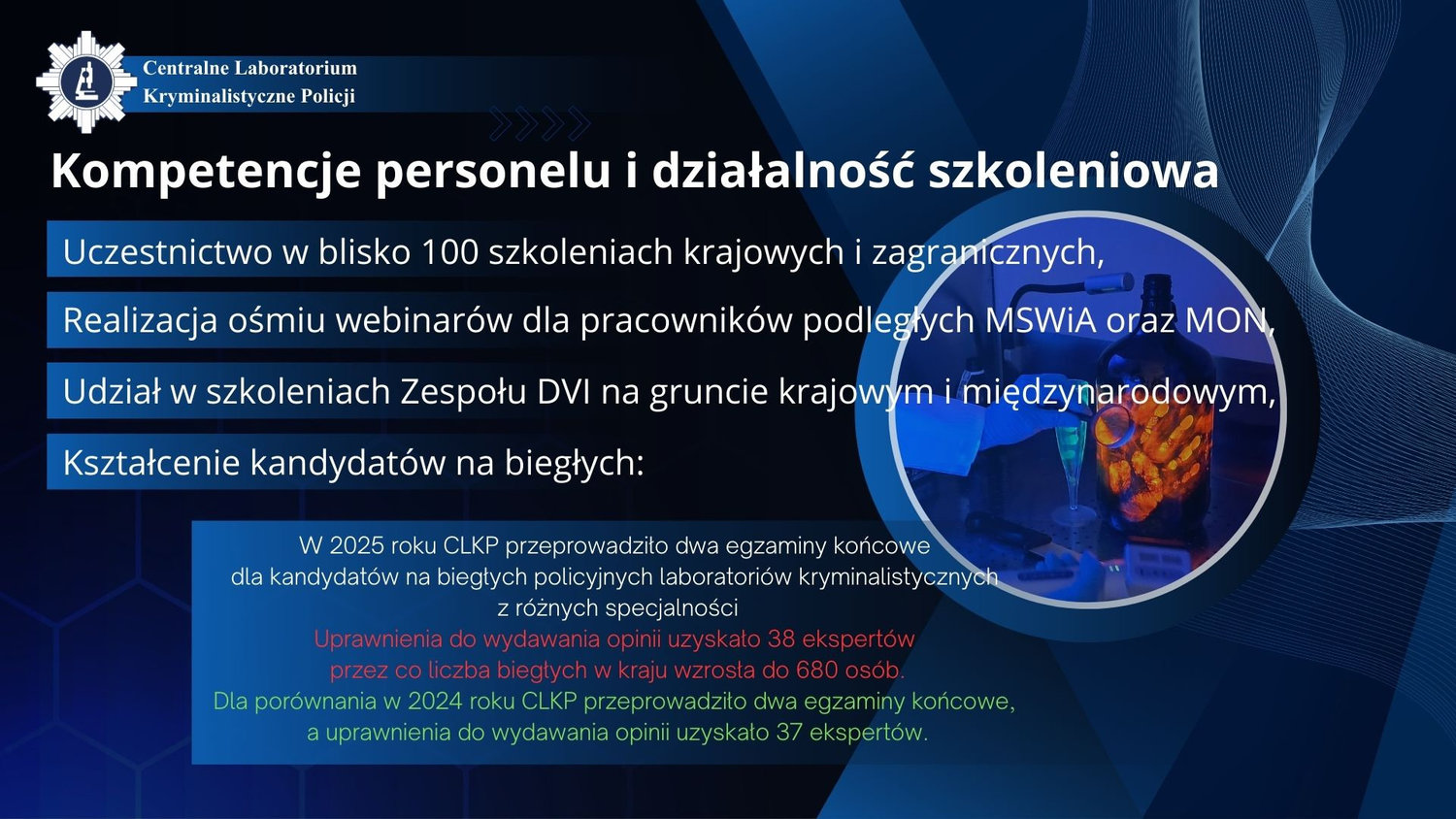 Jednostka pozostaje jedynym w kraju ośrodkiem, który prowadzi w pełni nadzorowany proces kształcenia i weryfikacji biegłych policyjnych laboratoriów kryminalistycznych. W 2025 r. przeprowadzono dwa egzaminy końcowe dla kandydatów na biegłych policyjnych laboratoriów kryminalistycznych. 38 ekspertów z różnych specjalności badań uzyskało uprawnienia do wydawania opinii, przez co liczba biegłych w kraju wzrosła do 680 osób. To kolejny dobry rok dla polskiej kryminalistyki, albowiem w 2024 r. takie uprawnienia uzyskało 37 ekspertów.