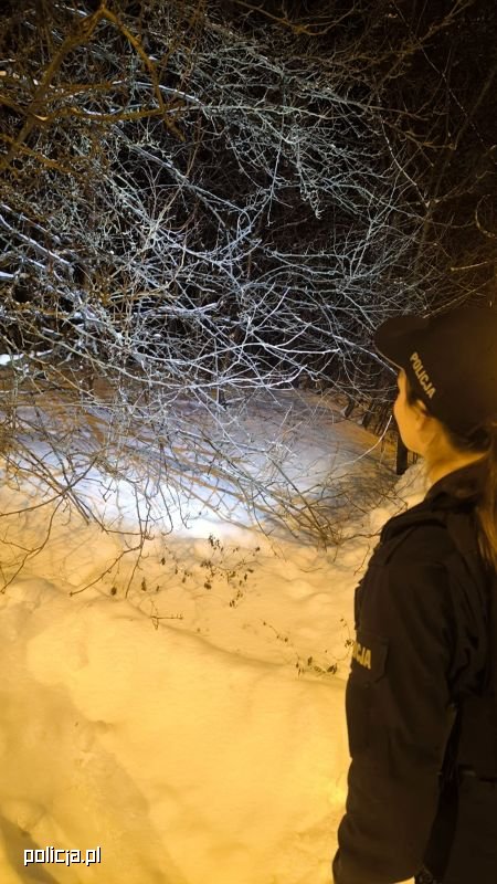 Funkcjonariusze natychmiast zorganizowali działania poszukiwawcze. Warunki atmosferyczne były trudne, zwłaszcza głębokie zaspy śnieżne utrudniały dokładne przeczesywanie lasu. Dzięki wytężonej pracy, zaangażowaniu i wytrwałości, funkcjonariusze odnaleźli potrzebującą w głębi lasu. Kobieta była wychłodzona i zbyt słaba, aby iść o własnych siłach. Policjanci natychmiast udzielili jej pierwszej pomocy przedmedycznej, okryli kocem i wezwali pogotowie ratunkowe. Karetka mogła dotrzeć jednak jedynie na skraj kompleksu leśnego, od którego dzieliła ich znaczna odległość. Policjanci doskonale zdawali sobie sprawę, że w tej sytuacji liczy się każda minuta. W krótkim czasie zorganizowali improwizowany transport przez śnieg i zarośla, korzystając z pomocy przypadkowego przechodnia, który użyczył im swoich sanek.