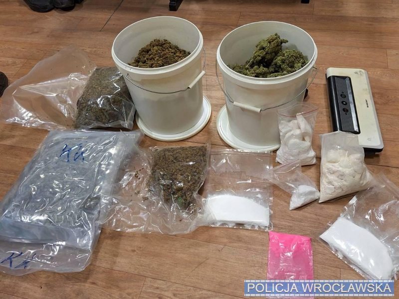 W mieszkaniu funkcjonariusze ujawnili znaczne ilości narkotyków, w tym marihuanę, amfetaminę, kokainę, MDMA oraz listki LSD. Na miejscu znajdowały się również przedmioty i sprzęt służący do ich porcjowania oraz dystrybucji – wagi elektroniczne, zgrzewarka, woreczki strunowe, a także telefony komórkowe, gotówka w różnych nominałach i walutach.