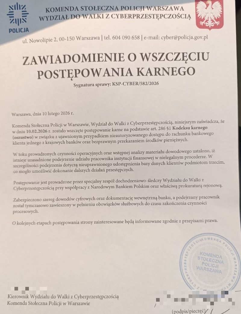 Z relacji kobiety wynika, że 10 lutego 2026 roku około godziny 13.33 zadzwoniła do niej nieznana kobieta, podająca się za pracownika instytucji parabankowej. Poinformowała o złożonym wniosku o pożyczkę na kwotę 3000 zł, gdy rozmówczyni zaprzeczyła, by składała jakikolwiek wniosek, usłyszała, że prawdopodobnie doszło do wycieku jej danych osobowych. Następnie z pokrzywdzoną kontaktowali się kolejni mężczyźni, przedstawiający się jako pracownicy działów bezpieczeństwa banków.