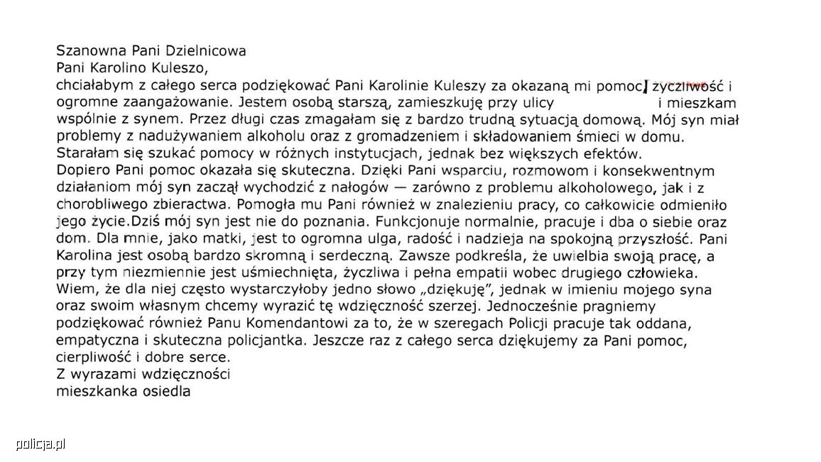 W liście kobieta podkreśliła, że dzięki rozmowom, systematycznym działaniom oraz indywidualnemu podejściu funkcjonariuszki udało się doprowadzić do wyraźnej poprawy sytuacji domowej i przywrócić poczucie spokoju oraz bezpieczeństwa. Autorka zaznacza, że profesjonalizm, empatia i konsekwencja dzielnicowej miały kluczowe znaczenie dla pozytywnych zmian, jakie nastąpiły w jej rodzinie.