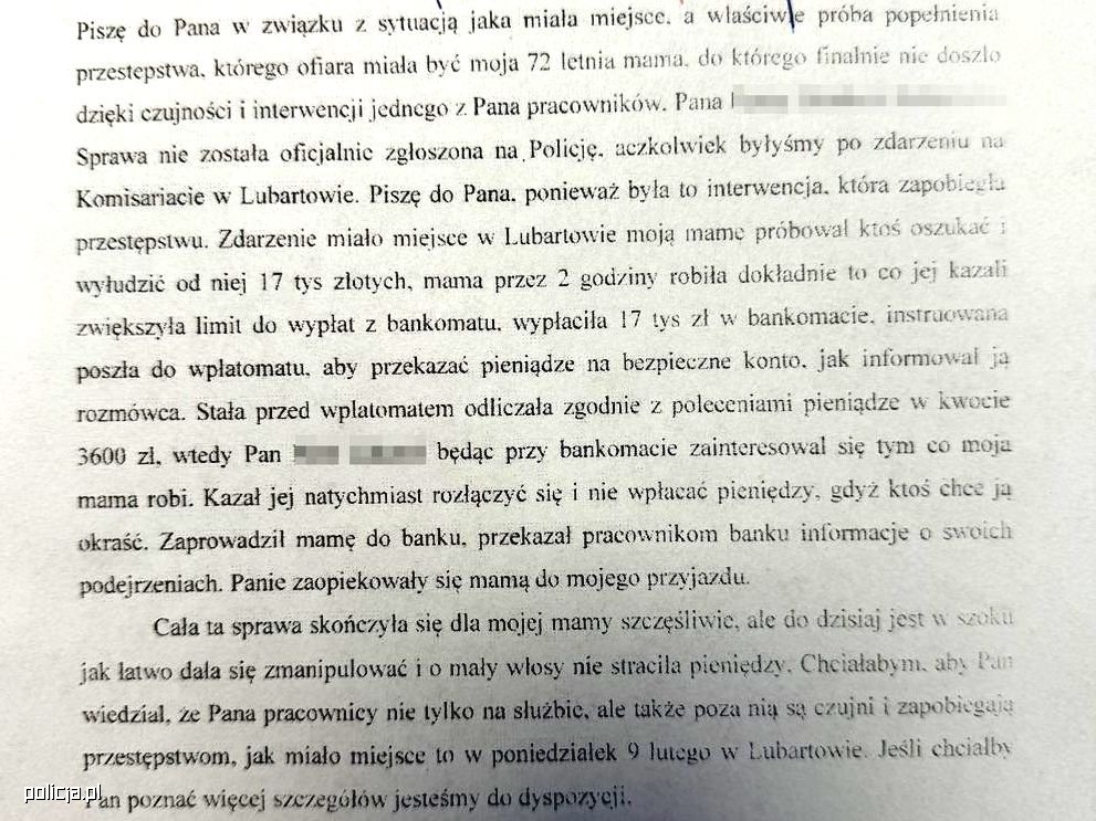W przesłanych do komisariatu podziękowaniach córka kobiety zaznaczyła, że jej mama „do dziś jest w szoku, jak łatwo dała się zmanipulować i o mały włos nie straciła pieniędzy”, a także podkreśliła, że policjanci „nie tylko na służbie, ale także poza nią są czujni i zapobiegają przestępstwom”.