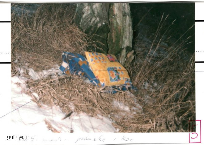 21 stycznia 2001 roku około godziny 14.45 policjanci Komendy Miejskiej Policji w Elblągu zostali powiadomieni przez mężczyznę o odnalezieniu w przydrożnym rowie, w okolicy miejscowości Kazimierzowo, zwłok nowo narodzonej dziewczynki. Dziecko było owinięte w charakterystyczny koc, obok leżała niewielka poduszka.