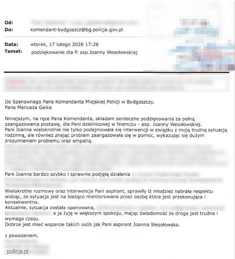 Ta, o której piszemy dotyczy trudnej sytuacji rodzinnej kobiety i jej dzieci. Wszystko na kanwie podziękowań, które wpłynęły na skrzynkę mailową Komendanta Miejskiego Policji w Bydgoszczy. Czytamy w nich o zaangażowaniu, empatii oraz wyjątkowej determinacji podczas czynności.