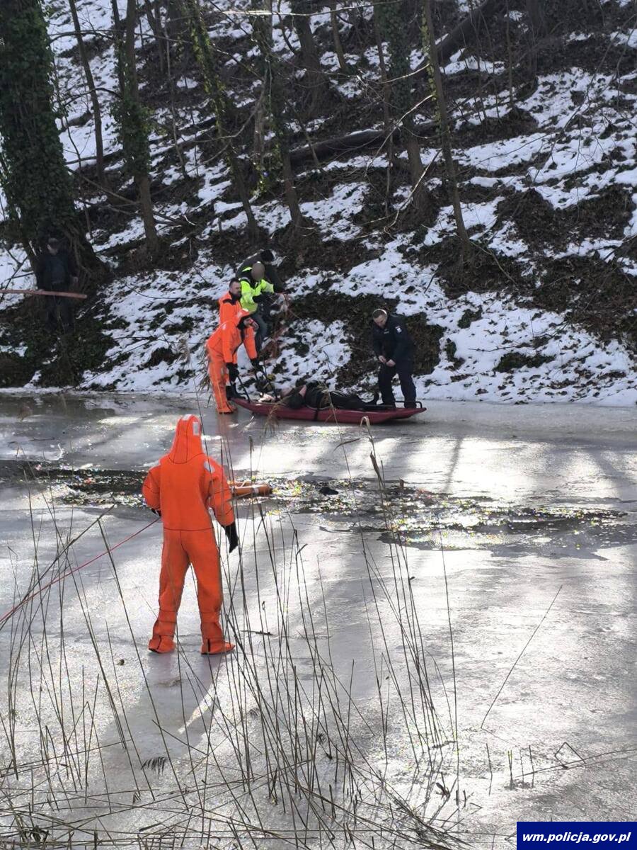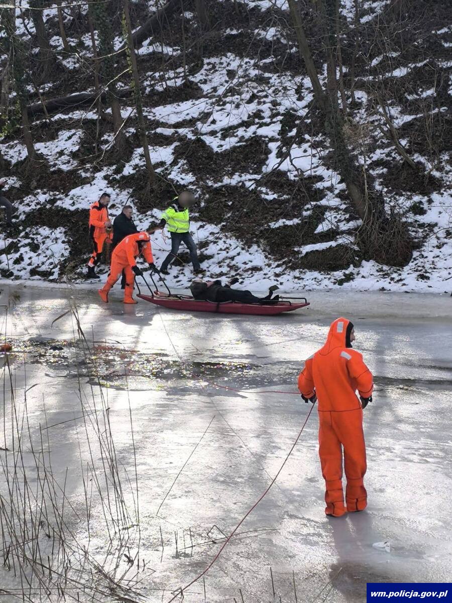 W tym czasie dobiegł asp. szt. Paweł Kutryb, który również położył się na zamarzniętą taflę lodu i czołgał się do poszkodowanych. Rzucił rzutkę ratowniczą i obwiązał linką nogę tonącego mężczyzny, którą resztkami sił udało mu się wystawić ponad lód.
