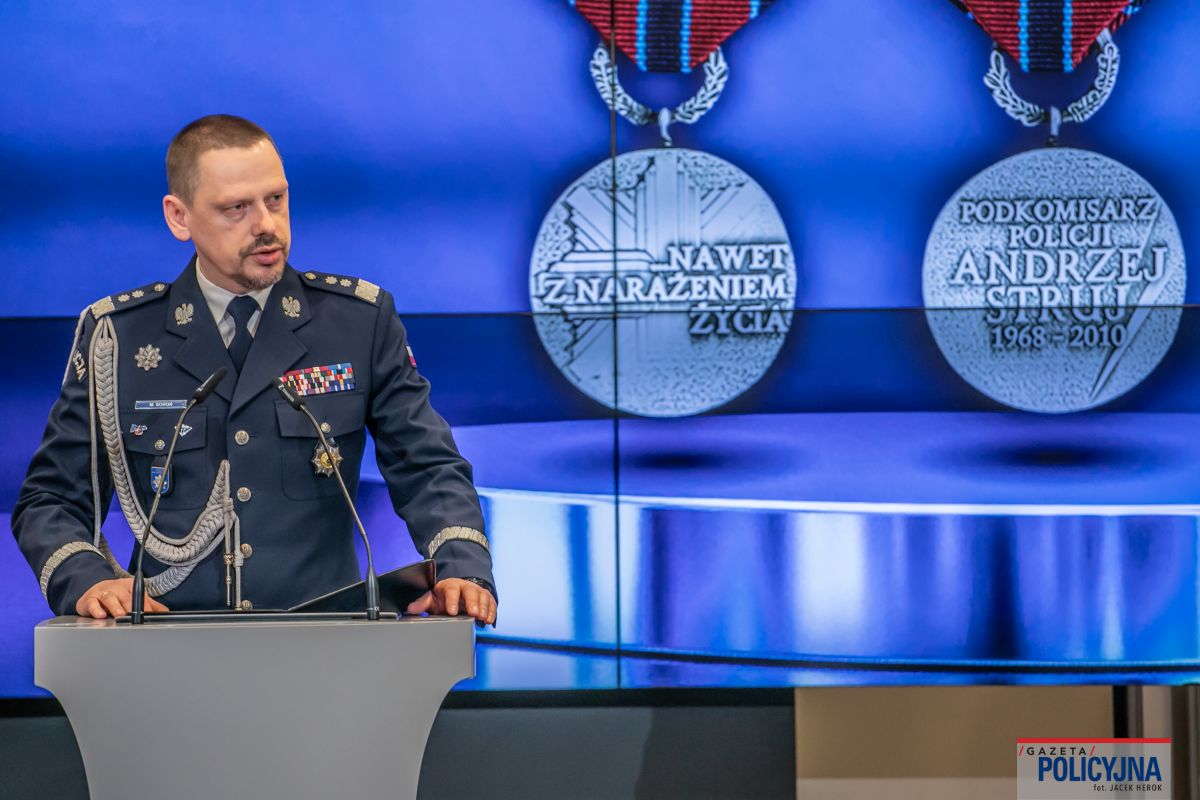 - Każdego dnia policjanci podejmują trudne decyzje i stają wobec nieprzewidywalnych sytuacji. Są nieustannie gotowi do działania w obronie życia i bezpieczeństwa innych i nigdy nie wiedzą, czy powrócą do swoich domów i rodzin. Podkomisarz Andrzej Struj, wypełnił rotę ślubowania do końca. Policjantki i policjanci, jako Komendant Główny Policji jestem z Was dumny. Z najwyższym uznaniem patrzę na Was i na Waszą postawę. To budzi mój najwyższy szacunek. Dzięki wam obywatele naszego kraju mogą czuć się bezpiecznie. Gratuluję otrzymanych odznaczeń i życzę wytrwałości, satysfakcji z pełnionych obowiązków oraz pomyślności w życiu osobistym.