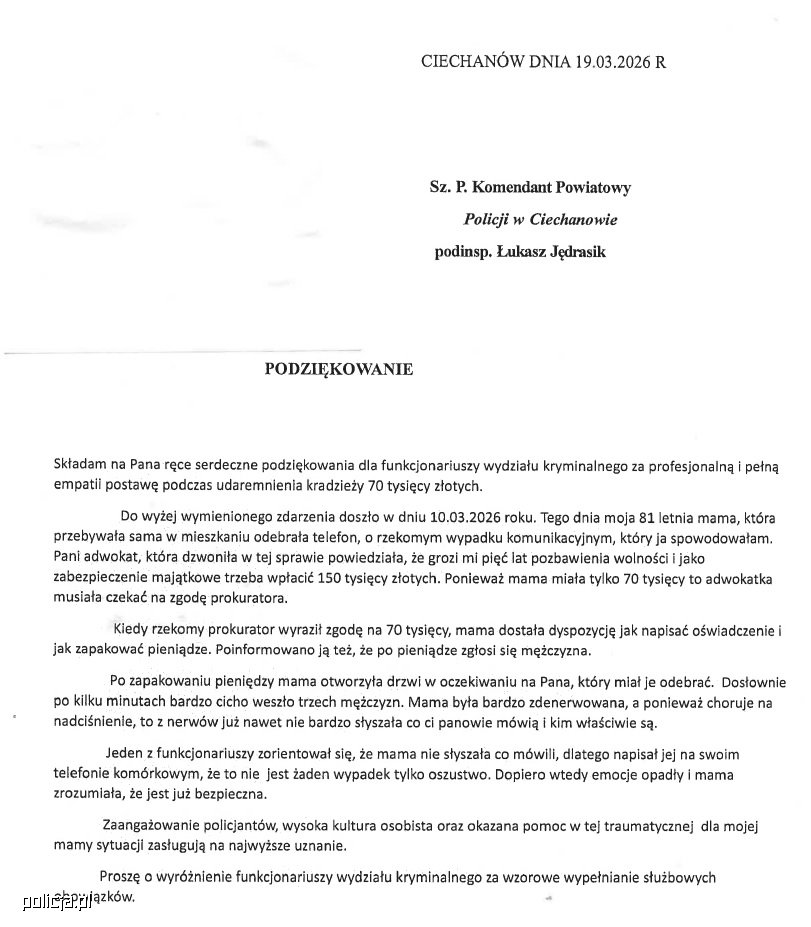 Do Komendanta Powiatowego Policji w Ciechanowie wpłynęły oficjalne podziękowania skierowane do funkcjonariuszy Wydziału Kryminalnego za skuteczne udaremnienie próby oszustwa metodą „na wypadek” oraz profesjonalne i empatyczne podejście do pokrzywdzonej.