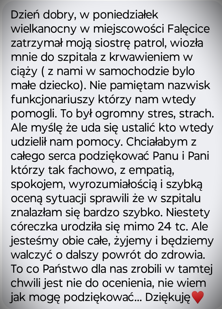 9 kwietnia br. do Komendy Powiatowej Policji w Białobrzegach wpłynął list z podziękowaniami od kobiety, której funkcjonariusze udzielili pomocy. W swoim piśmie podkreśliła, że policjanci działali „fachowo, z empatią, spokojem i wyrozumiałością”, dzięki czemu błyskawicznie znalazła się w szpitalu. Zaznaczyła, że ich reakcja zwiększyła szanse na przeżycie jej i jej dziecka.