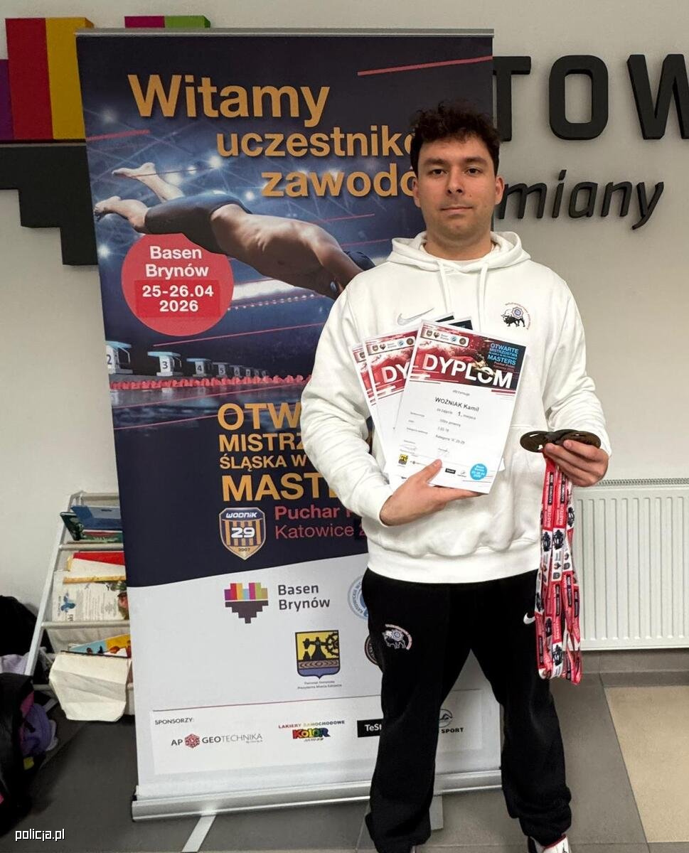Sierżant Kamil Woźniak, funkcjonariusz Oddziału Prewencji Policji w Białymstoku, po raz kolejny udowodnił, że policyjny mundur doskonale łączy się z pasją do sportu. Podczas otwartych Mistrzostw Śląska w Pływaniu Masters - Puchar Polski Masters Katowice 2026 zdobył aż cztery medale, prezentując znakomitą formę oraz wolę walki.