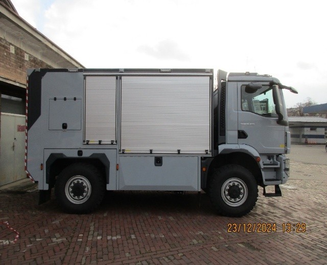 Zdjęcie przedstawia bok pojazdu do przewozu materiałów wybuchowych skonstruowany na podwoziu samochodu ciężarowego maki MAN TGM 18.320 -