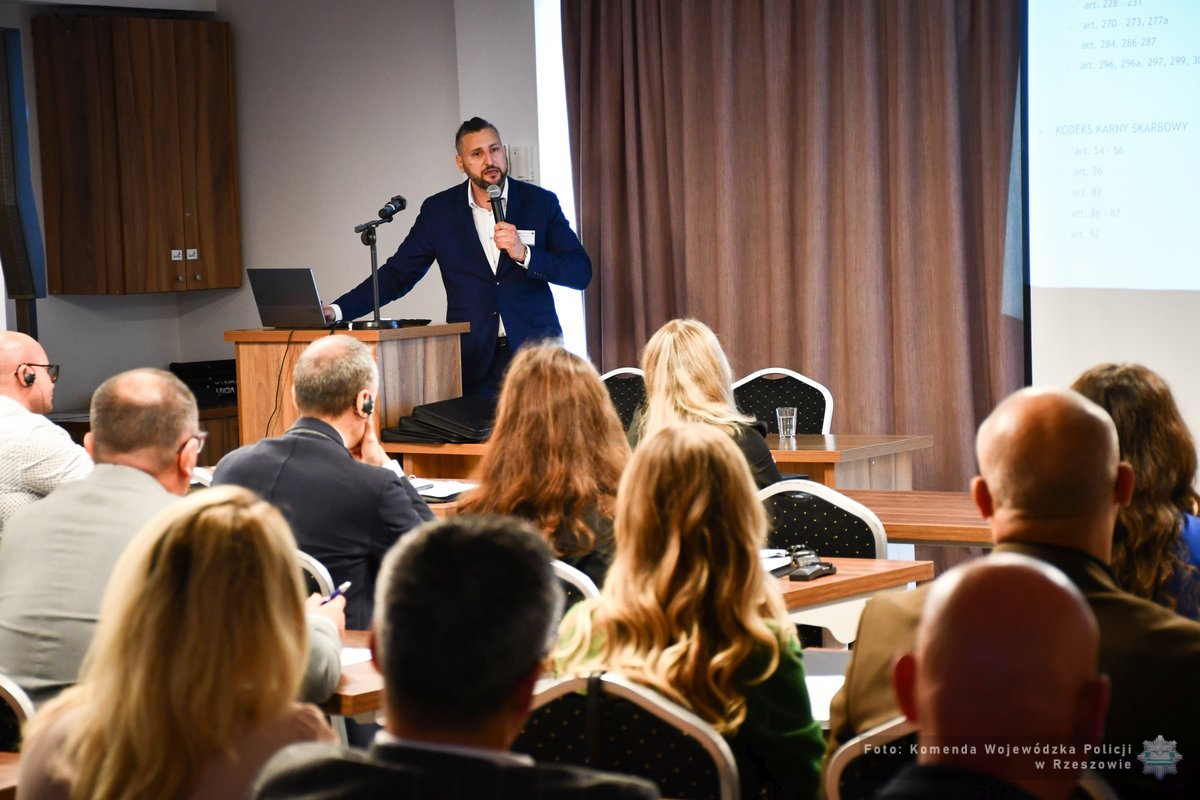 Kolejnym prelegentem był podkom. Marcin Ochmański z Wydziału dw. z Przestępczością Gospodarczą Biura Zwalczania Przestępczości Ekonomicznej KGP, który mówił o zagrożeniach dla systemu przeciwdziałania praniu pieniędzy w najbliższej perspektywie - wyzwania, luki, rekomendacje. Następnie głos zabrał Arkadiusz Jarosz, Prokurator Okręgowy w Rzeszowie, który przedstawił specyfikę przestępstw związanych z uszczupleniem podatku VAT i transgranicznym elementem ich zwalczania.