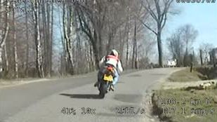 Radiowóz ruszył za nim w pościg, a videorejestrator zapisywał kolejne wykroczenia popełniane przez motocyklistę, a były to najczęściej przekroczenia prędkości - rekordowe to ponad 150 km/h w terenie zabudowanym, gdzie zgodnie z przepisami powinien jechać nie szybciej niż 50 km/h, ale też kilkakrotnie wyprzedzał w miejscach niedozwolonych, zmusił kierującego innym autem do gwałtownego hamowania w celu uniknięcia zderzenia, nieco dalej pieszy salwował się upadkiem na skarpę by uniknąć potrącenia.