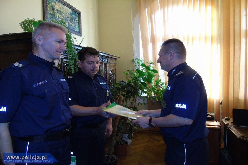 Za szybkie i sprawnie przeprowadzone działania, które z całą pewnością uchroniły mieszkańców przed tragedią, Komendant Powiatowy Policji w Dzierżoniowie - insp. Marek Mitraszewski - wyróżnił sierż. szt. Jarosława Dzimirę oraz sierż. szt. Roberta Rosiaka nagrodą pieniężną oraz dyplomami.
