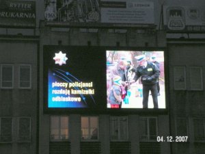 W centrum miasta, naprzeciw największego w mieście parkingu, umieszczony jest ogromny ekran diodowy. Z odległości kilkudziesięciu metrów przechodnie i kierowcy ogladają dynamiczne informacje: "Policja ostrzega!” albo "Policja przypomina!”