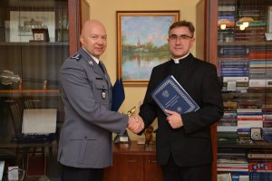 Komendant-Rektor Wyższej Szkoły Policji w Szczytnie insp. dr hab. Piotr Bogdalski oraz Rektor Uniwersytetu Kardynała Stefana Wyszyńskiego ks. prof. dr hab. Stanisław Dziekoński podpisali porozumienie o współpracy naukowo-badawczej oraz naukowo-dydaktycznej.