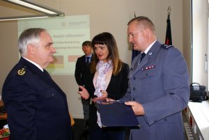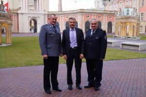 Ponadto Komendanci mieli okazję uczestniczyć w Parlamencie Branderburgii na spotkaniu z Ministrem Spraw Wewnetrznych Branderburgii, Panem Karlem-Heinze Schroeter. Z kolei Wizyta w Ambasadzie RP w Berlinie zakończyła się spotkaniem z oficerem łącznikowym polskiej policji w Niemczech- Wiesławem Gomem, który wcześniej pełnił służbę jako koordynator Policji Polskiej w Polsko-Niemieckim Centrum Współpracy w Świecku.
