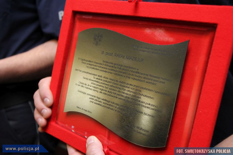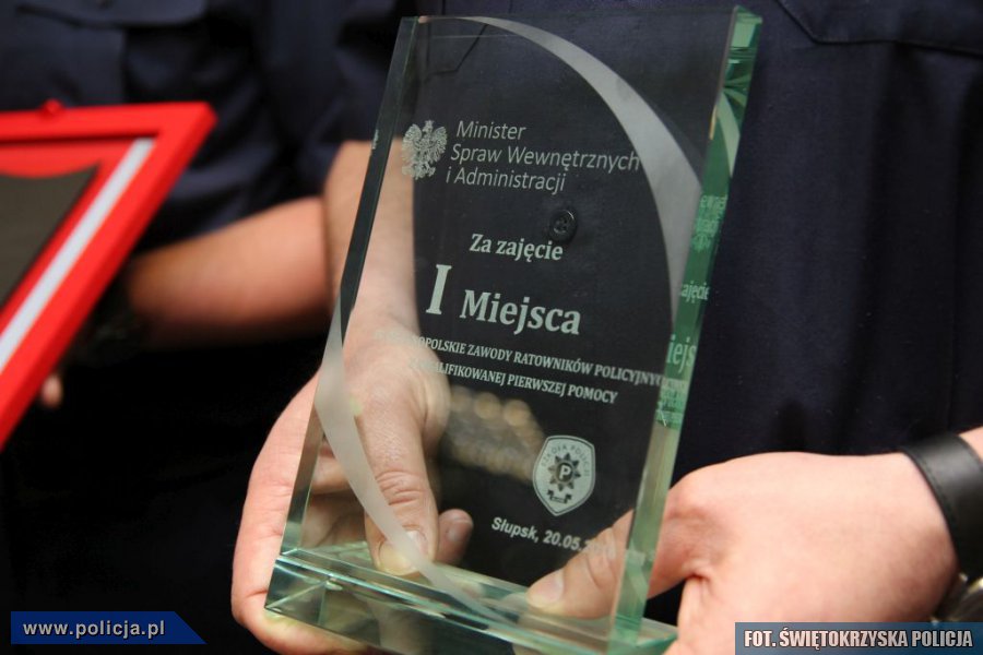 W kwietniu w Komendzie Wojewódzkiej Policji w Kielcach odbyły się wojewódzkie eliminacje IV Ogólnopolskich Zawodów Ratowników Policyjnych z Kwalifikowanej Pierwszej Pomocy. W zawodach uczestniczyło wówczas 13 dwuosobowych drużyn składających się z przedstawicieli pionów Prewencji i Ruchu Drogowego, posiadających uprawienia ratowników kwalifikowanej pierwszej pomocy. W takcie eliminacji wyłoniono zwycięski patrol – funkcjonariuszy Oddziału Prewencji Policji w Kielcach, którzy w ubiegłym tygodniu w Słupsku reprezentowali garnizon świętokrzyski w Zawodach Ratowników Policyjnych. Spośród 17 drużyn biorących udział w zawodach, pierwsze miejsce zajęli nasi policjanci - st. sierż. Michał Machulski i sierż. Michał Kwieciński. Zwycięzcą oraz ich kierownikowi drużyny st. post. Rafałowi Maziejukowi osobiście pogratulował p.o. Komendanta Wojewódzkiego Policji w Kielcach insp. Artur Bednarek, Pierwszy Zastępca Komendanta Wojewódzkiego Policji w Kielcach mł. insp. Roman Sobczak, p.o. Zastępcy Komendanta Wojewódzkiego Policji w Kielcach mł. insp. Artur Bielecki oraz Wicewojewoda Świętokrzyski Andrzej Będkowski.