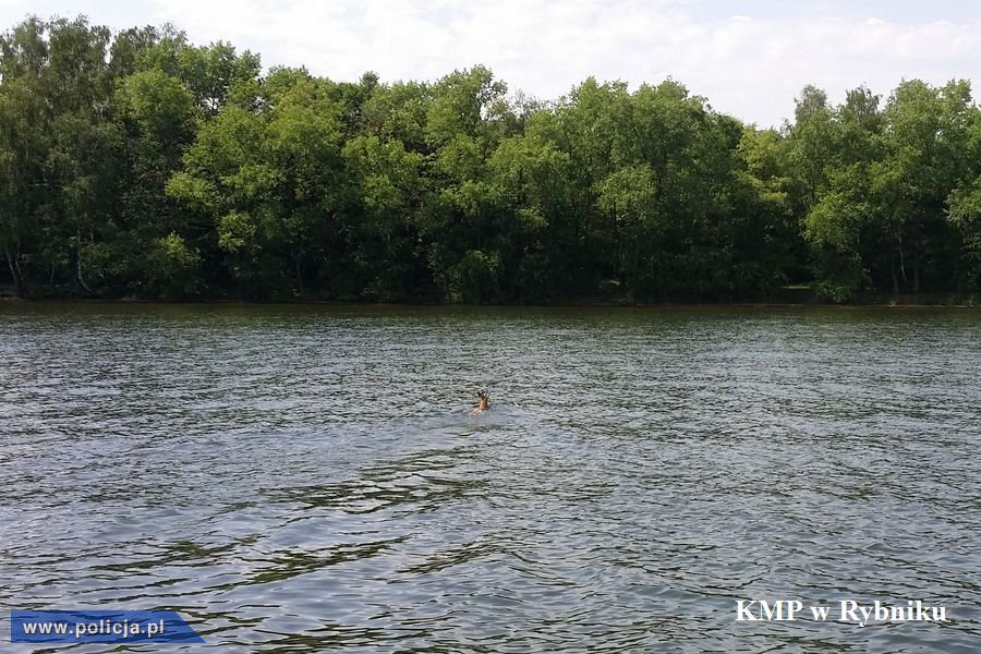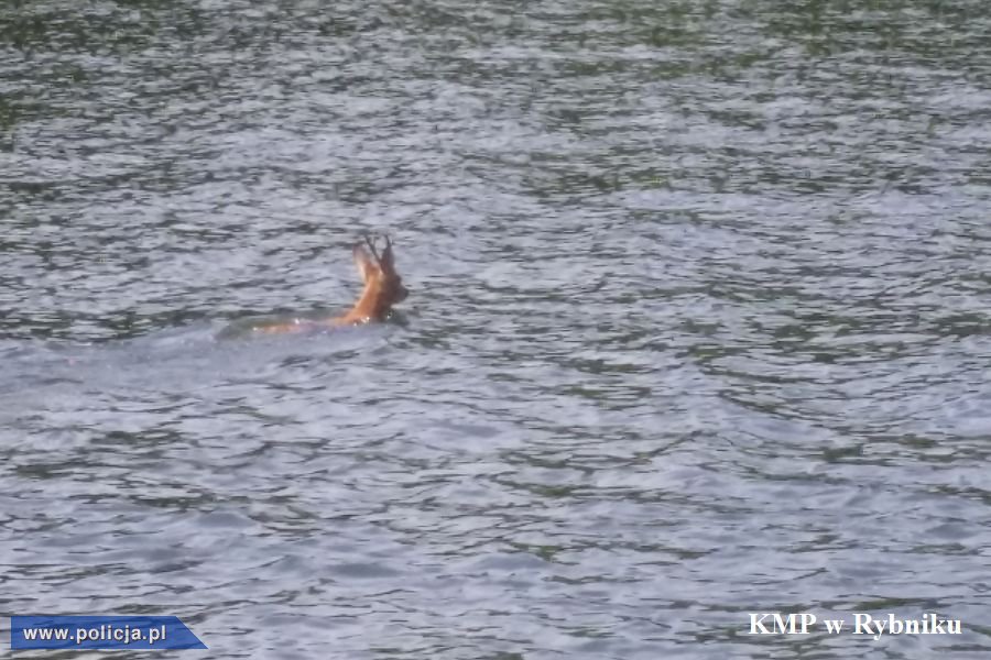 Policyjni wodniacy z rybnickiej komendy, podczas patrolu motorówką Zalewu Rybnickiego, zauważyli wystający z wody konar drzewa. Kiedy mundurowi podpłynęli bliżej, byli zaskoczeni tym co zobaczyli. Okazało się, że w wodzie pływa młody jeleń. Jelonek znajdował się kilkaset metrów od brzegu. Zwierzę było zdezorientowane i przestraszone pływającymi wokół żaglówkami. Widać było, że nie może wrócić na brzeg. Policjanci chcieli wyciągnąć zwierzę z wody liną, ale za każdym razem, kiedy mundurowi podpłynęli bliżej, „rogaty pływak” płynął w przeciwnym kierunku. Policyjni wodniacy wykorzystali ten fakt i podprowadzili uciekającego przed nimi jelenia do brzegu. Pod czujnym okiem stróżów prawa jelonek, po około 15 minutach, dopłynął do brzegu i uciekł do lasu. Jest to dla niego zdecydowanie bardziej odpowiednie miejsce, niż wody Zalewu Rybnickiego. Gdyby nie akcja rybnickich policjantów, mały jeleń najprawdopodobniej by utonął.