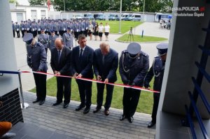 Następnie po okolicznościowych przemówieniach Starosty Powiatu Wodzisławskiego Pana Ireneusza Serwotki i Prezydenta Miasta Wodzisławia Śląskiego Pana Mieczysława Kieca, budynek komendy został poświęcony przez Dziekana Dekanatu Wodzisławskiego ks. Janusza Badurę. Symbolicznego przecięcia wstęgi dokonali: Komendant Wojewódzki Policji w Katowicach insp. Krzysztof Justyński, Zastępca Komendanta Wojewódzkiego Policji w Katowicach insp. Piotr Kucia, Komendant Powiatowy Policji w Wodzisławiu Śląskim mł. insp. Jarosław Grudziński, Starosta Powiatu Wodzisławskiego Ireneusz Serwotka oraz Prezydent Miasta Wodzisławia Śląskiego Mieczysław Kieca.