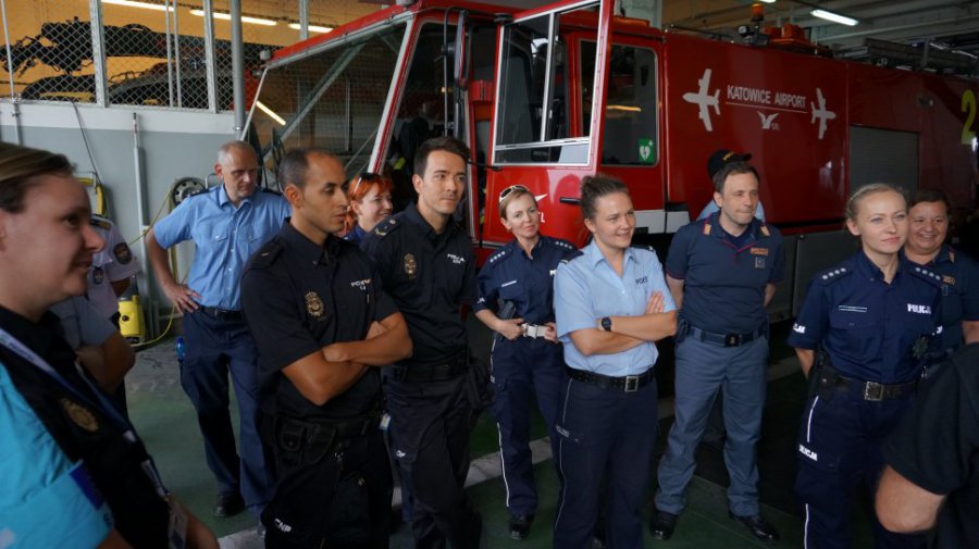 Mundurowi mieli również okazję zobaczyć Miejski Ratusz i Rynek, gdzie odbywa się większość tarnogórskich imprez masowych. Następnie wszyscy udali się do Międzynarodowego Portu Lotniczego w Katowicach – Pyrzowicach, gdzie przedstawiciele Straży Granicznej oraz Straży Pożarnej zapoznali ich ze sprzętem, jakim posługują się w codziennej służbie. Goście dowiedzieli się, jak wygląda współdziałanie policjantów z miejscowymi władzami lokalnymi oraz innymi służbami mundurowymi takimi, jak Straż Graniczna, Służba Ochrony Lotniska, Wojsko czy Straż Pożarna. Po zakończonym spotkaniu w Tarnowskich Górach, mundurowi wrócili do Krakowa, gdzie będą pełnili dalszą służbę, zabezpieczając Światowe Dni Młodzieży.