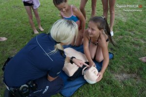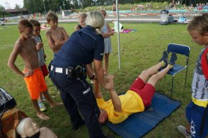 Drugim celem akcji profilaktycznej było podnoszenie świadomości i umiejętności w zakresie udzielania pierwszej pomocy przedmedycznej. W miniony piątek policjanci posiadający specjalistyczne wyszkolenie medyczne, wspólnie z ratownikami świętochłowickiego WOPR-u prowadzili warsztaty i wykłady z udzielania pierwszej pomocy dla wszystkich obecnych na basenie tego dnia osób. Stanowisko cieszyło się bardzo dużym zainteresowaniem zarówno ze strony młodzieży, jak i osób starszych. Omawiane były zagadnienia związane m.in. z ratowaniem osoby podtopionej, wyciągniętej z wody, osoby, która z niewyjaśnionych przyczyn straciła przytomność. Przećwiczono również wszystkie pozycje ułożenia osoby poszkodowanej w wypadku. Wszyscy uczestnicy warsztatów mogli ćwiczyć nabyte w ten sposób umiejętności na wypożyczonych przez WOPR specjalnych manekinach.