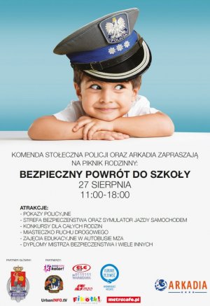 Stołeczni policjanci, jak co roku, serdecznie zapraszają dzieci oraz ich opiekunów na piknik, który odbędzie się w najbliższą sobotę, tj. 27 sierpnia w godzinach 11–18, na terenie przyległym do CH Arkadia w Warszawie. Na najmłodszych, oprócz solidnej dawki wiedzy na temat bezpiecznych zachowań w różnych miejscach, będzie czekało m.in. miasteczko ruchu drogowego, pokaz sprzętu policyjnego oraz liczne konkursy z nagrodami.