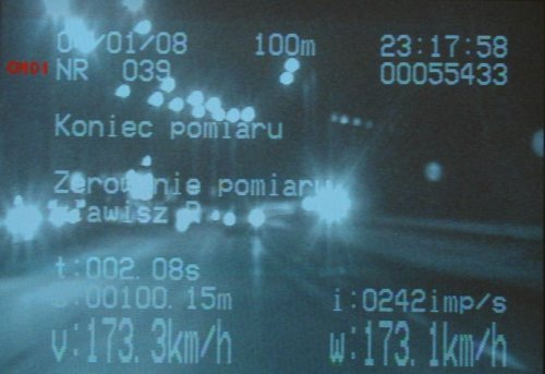 Kierowca stwarzał zagrożenie na drodze, zmieniając często pasy, jadąc „slalomem” pomiędzy innymi autami i łamiąc wszelkie zasady oraz przepisy ruchu drogowego. Pierwszy pomiar prędkości na odcinku, na którym obowiązywało jej ograniczenie do 80 km/h, dał wynik o 93 km większy. Audi jechało z prędkością 173 km/h. Na zwężeniu drogi, gdzie prędkość była ograniczona do 40 km/h, pirat drogowy przekroczył ją o 114 km. Wówczas samochód jechał 154 km/h.