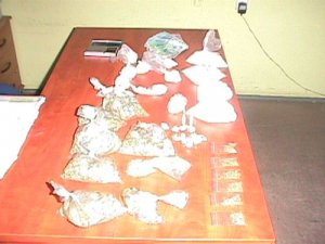 Funkcjonariusze przeszukali mieszkanie. W kuchni znaleźli torebkę z tabletkami ekstazy i 11 zawiniątek z folii aluminiowej z marihuaną. W pojemniku na herbatę, stojącym na blacie kuchennych znajdowało się 6 torebek z „trawką”. Na balkonie w reklamówce handlarz ukrył 6 torebek z marihuaną i 8 torebek z amfetaminą. W drugiej reklamówce stojącej na balkonie kryminalni ujawnili 5 woreczków foliowych z zawartością tabletek ekstazy. Łącznie kryminalni zabezpieczyli niespełna 1000 tabletek ekstazy, 1 kg amfetaminy i 655 gram marihuany, wagę elektroniczną i pieniądze w kwocie 2390 złotych na poczet przyszłych kar.