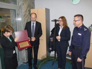 Komendant Rejonowy Policji Warszawa V mł. insp. Lech Bielak w imieniu Komendanta Stołecznego Policji wręczył pamiątkową tabliczkę i złożył gratulacje kasjerce oraz dyrektorom oddziału jednego z banków. A wszystko za to, że dzięki czujności, intuicji, kompetencji i pełnemu profesjonalizmowi ze strony pracownicy banku nie doszło do oszustwa metodą „na policjanta CBŚP”. Klient banku nie stracił 50 tysięcy złotych, a podejrzany o popełnienie tego przestępstwa został zatrzymany.