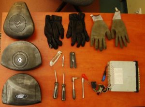 W plecaku, na tylnym siedzeniu samochodu, policjanci znaleźli cztery poduszki powietrzne oraz samochodowe radio. W wyrzuconych ubraniach z kolei były rękawiczki oraz narzędzia, które mogły służyć do wyciągania poduszek z samochodów.