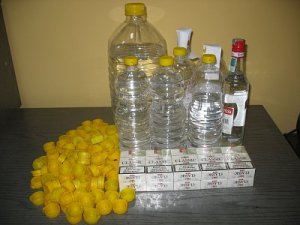 Wczoraj policjanci wkroczyli do mieszkania. W pokojach i samochodzie znaleźli prawie 80 litrów wyrobów spirytusowych i papierosy bez polskich znaków akcyzy skarbowej.