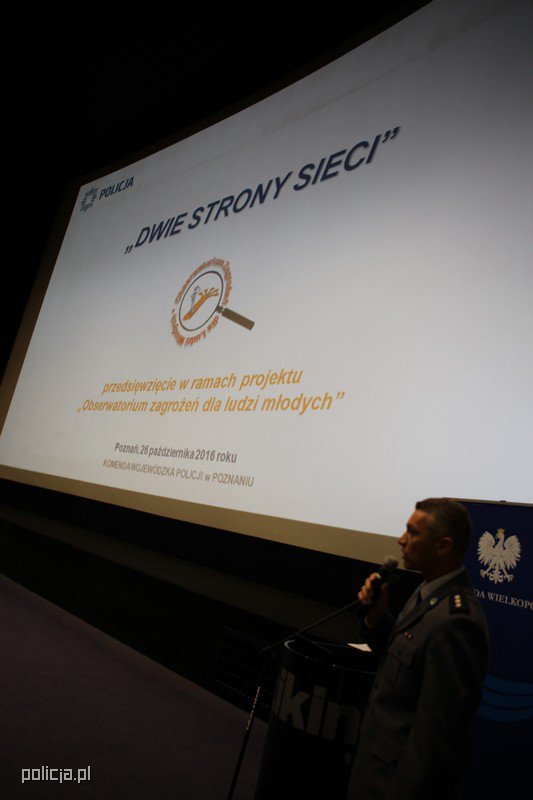 26 października br. w sali kinowej Multikina 51 odbyła się konferencja „Dwie strony sieci”. To przedsięwzięcie jest częścią projektu „Obserwatorium Zagrożeń dla Ludzi Młodych”. Patronat honorowy nad tym przedsięwzięciem objęli Wojewoda Wielkopolski oraz Marszałek Województwa Wielkopolskiego. Partnerami wielkopolskiej Policji w tej konferencji byli Bank Zachodni WBK, TVP 3 Poznań oraz Multikino.