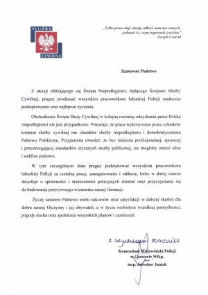 8 listopada 2016 roku z okazji Święta Służby Cywilnej, insp. Jarosław Janiak Komendant Wojewódzki Policji w Gorzowie Wlkp. wraz ze swoimi Zastępcami spotkał się z pracownikami Policji, aby podziękować za ich pracę oraz za wkład we właściwe funkcjonowanie naszej formacji. Święto było okazją do wręczenia przez Komendanta Wojewódzkiego Policji w Gorzowie Wlkp., insp. Jarosława Janiaka listów gratulacyjnych dwudziestu pracownikom Policji zatrudnionym w KWP w Gorzowie Wlkp.