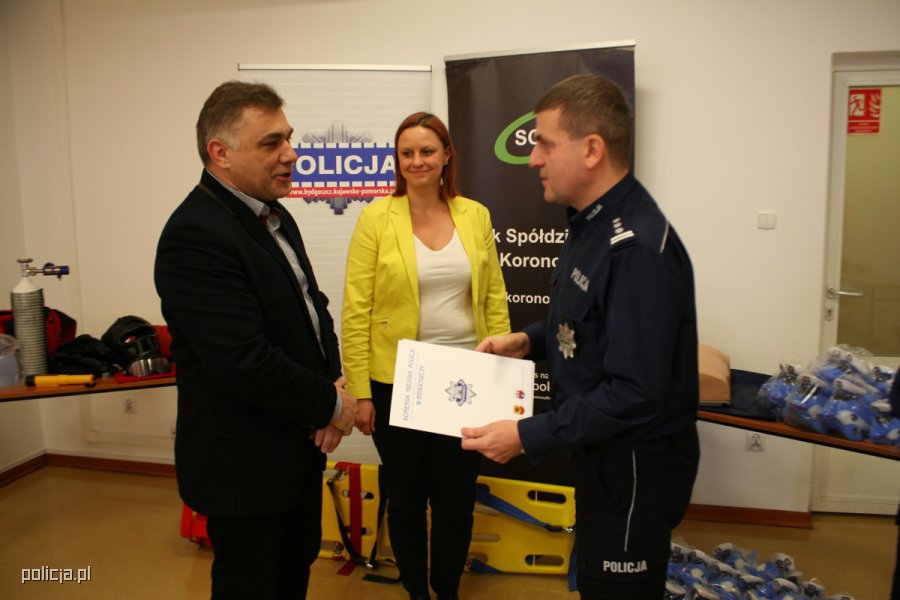 Inhalator tlenowy, alcoblow, fantom, alkogogle to tylko część podarowanego bydgoskim policjantom sprzętu. Bank Spółdzielczy w Koronowie, bo o nim mowa, od wielu lat wspomaga funkcjonariuszy Komendy Miejskiej Policji w Bydgoszczy przekazując im sprzęt służący do zapewnienia bezpieczeństwa, a niejednokrotnie ratowania ludzkiego życia.