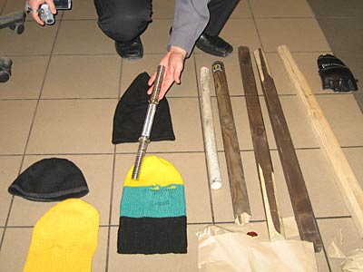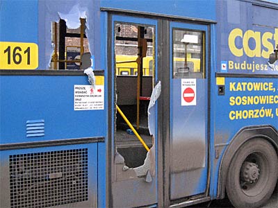 Dzisiaj około 4:00 nad ranem mieszkaniec Katowic poinformował oficera dyżurnego Policji, że na parking przy ulicy Słonecznej podjechało kilka samochodów, z których wysiadło ok. 20 mężczyzn zamaskowanych w kominiarki i uzbrojonych w drewniane pałki. Na miejsce natychmiast pojechali policjanci. Na ulicy Ściegiennego funkcjonariusze zobaczyli stojący na przystanku autobus komunikacji miejskiej linii nr 930. W pojeździe, którym grupa młodzieży wracała z dyskoteki powbijane były szyby.