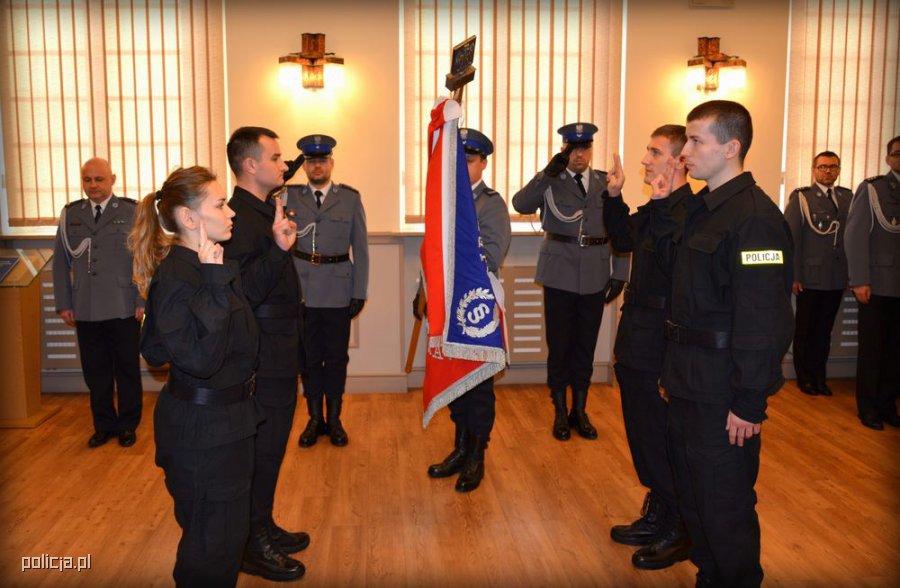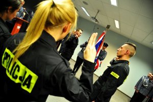 "Ja obywatel Rzeczpospolitej Polskiej, świadom podejmowanych obowiązków policjanta..." - to początek roty ślubowania, którą składają przyjmowani do służby funkcjonariusze. Nowi policjanci ślubując na sztandar tym samym wstąpili w szeregi polskiej Policji.