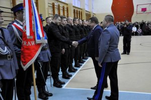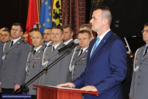 Wojewoda Jarosław Wieczorek w swoim przemówieniu przywitał w mundurowych szeregach nowo przyjętych policjantów, życząc im sukcesów podczas nauki w szkole policji, a także w późniejszej służbie. Szef śląskiego garnizonu policji insp. Krzysztof Justyński podkreślił, że w rocie ślubowania, którą przed chwilą wypowiedzieli najmłodsi stażem policjanci, zobowiązali się oni do służby nawet z narażeniem życia. Jako przykład do naśladowania wskazał im sierż.szt. Grzegorza Kobzę z komendy w Cieszynie. W listopadzie ubiegłego roku uratował on z pożaru 2 kobiety, a następnie wyniósł z płonącego budynku butle gazowe. Za ten właśnie czyn został nagrodzony przez komendanta wojewódzkiego.