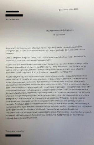 - Szanowny Panie Komendancie, chciałabym na Pana ręce złożyć serdeczne podziękowania dla funkcjonariuszy III Komisariatu Policji w Katowicach, a w szczególności dla st. asp. Łukasza Samelaka (...) Wykazał się nie tylko wysokim profesjonalizmem, ale przede wszystkim zaangażowaniem i chęcią szczerej pomocy w walce z patologią. Chciałabym podziękować również dwóm funkcjonariuszkom, które były na interwencji w moim mieszkaniu. Myślę, że kobieca empatia i ludzkie podejście żeńskiej części Policji są niezbędne i bardzo potrzebne do odbudowania wśród społeczeństwa zaufania do organów odpowiedzialnych za bezpieczeństwo i przestrzeganie prawa. Mam nadzieję, że w Państwa szeregach jest więcej takich wzorcowych funkcjonariuszy, którzy swoją służbę traktują jak powołanie do realizacji słusznych i szczytnych celów - napisała w liście mieszkanka Stockholmu.