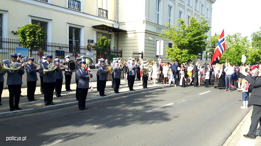 Po raz pierwszy w obchodach Święta Konstytucji Norwegii brała udział Orkiestra Reprezentacyjna Policji. Policyjna orkiestra uświetniła tradycyjny pochód wszystkich, którzy przybyli do Dolinki Szwajcarskiej w Warszawie aby radośnie uczcić to święto.